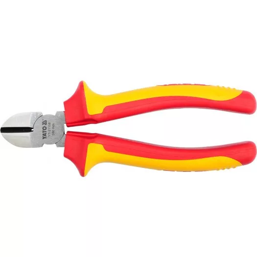 Oldalvágó fogó YT-21158 VDE szigeteléssel, kiváló minőségű CrV acélból. A vágóelem teljes hosszában csúszásmentes hornyokkal ellátott penge.