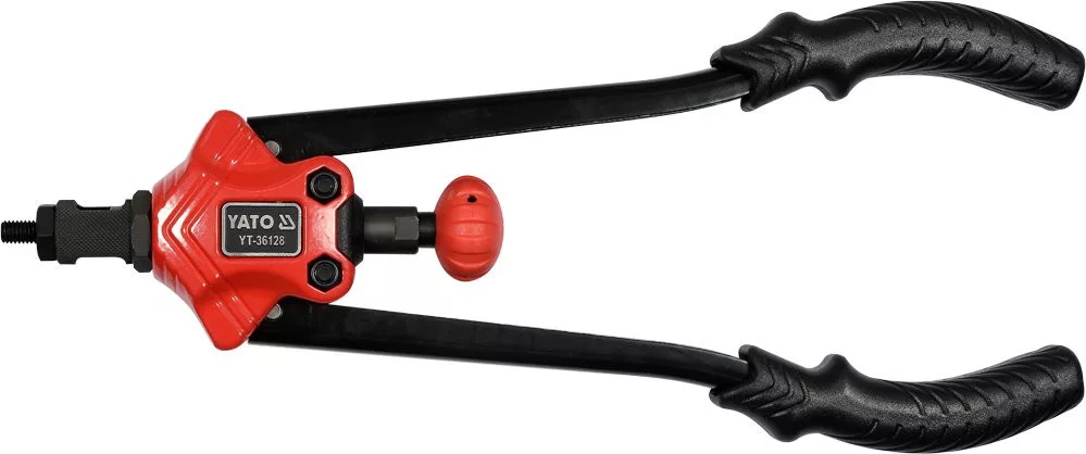 YATO YT-36128 kézi szegecselőgép M3-M12 anyákhoz A YT-36128 szegecselt anyák segítségével történő anyagösszekötések készítésére szolgál. Anyagcsatlakozásokat készít belső menetes hüvely segítségével. Ez lehetővé teszi további alkatrészek fémcsavarokkal vagy csavarokkal történő felcsavarozását. Fejek méretben: M3,M4,M5,M6,M8,M10,M12 tartós CrMo króm-molibdén szerszámacélból. Fogantyúk csúszásmentes gumírozott béléssel.
