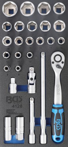 BGS technic 1/3 Szerszámtálca szerszámkocsihoz: 27 részes dugókulcs készlettel, 1/2", 8-32 mm (BGS 4126)