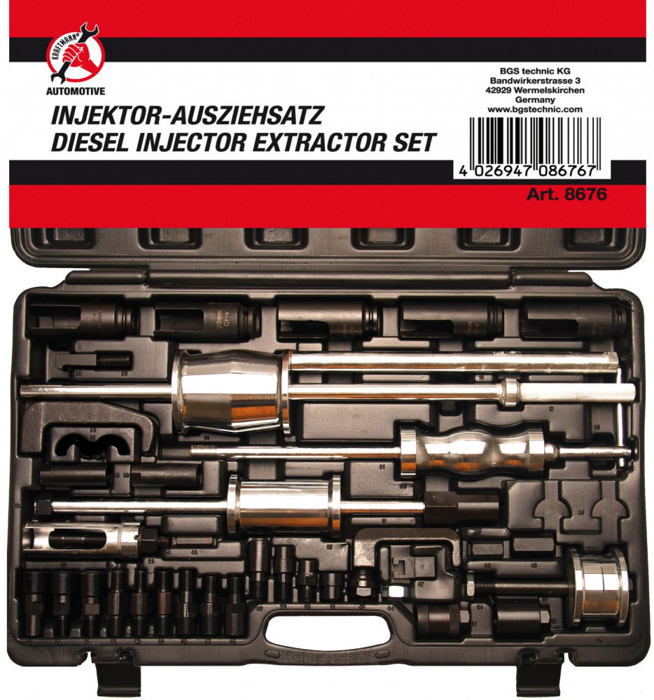 Számos adapterének köszönhetően a készlet alkalmas a legtöbb dízel injektor kiszerelésére.