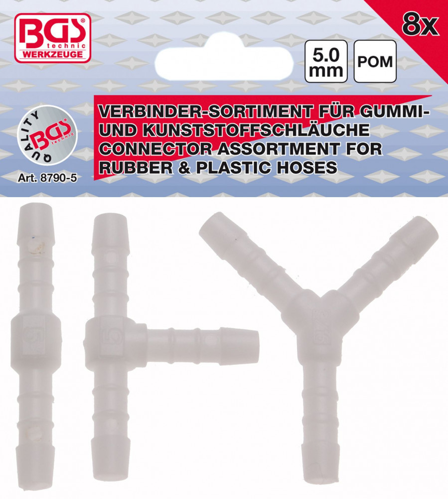 BGS technic 8 darabos csatlakozó készlet, 5mm belső átmérőjű gumi és műanyag csövekhez (BGS 8790-5)